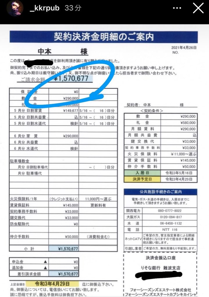 また、菊池氏が払ったというマンションの入居時の支払明細書などを、証拠としてSNSにあげていました。