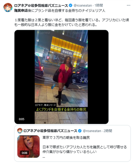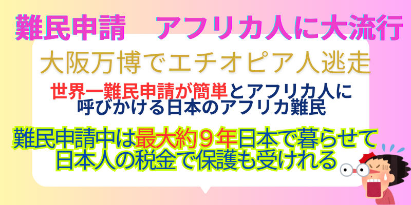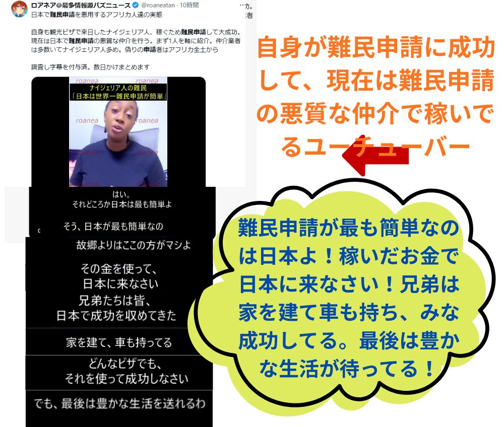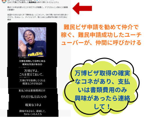 観光ビザやビジネスビザなどで、まず入国するしか難民の人にはやり方がないため、今回万博ビザで入ったというのだが、実は、難民申請に成功したアフリカ人たちが、国内で喜んで幸せ自慢をユーチューブで配信して、いかに日本が楽しいかをアピールし、アフリカの人々の日本への気持ちを仰いでいる。