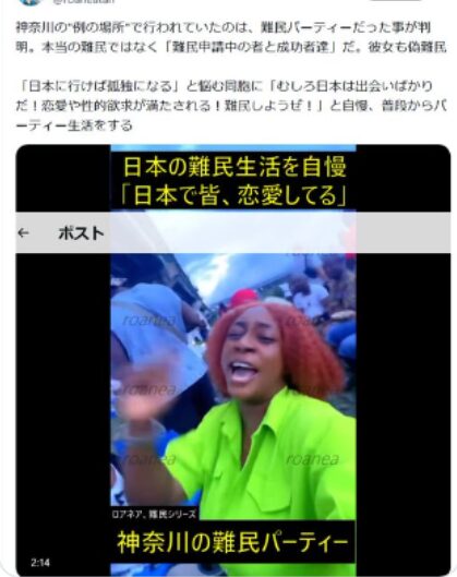 神奈川県で難民パーティーが開かれてる様子で、「日本に行けば、出会いだらけで恋愛も性的欲求も満たされるから難民しようぜ!」と訴えている様子がこちらだ。