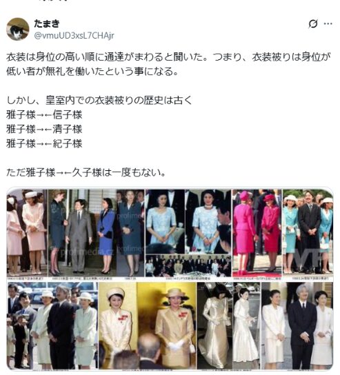 今回の色かぶりにSNSでは、年下の愛子様の方が、地味な赤で、スカート丈もひざ下で落ち着きのある装いを指摘されていました。
