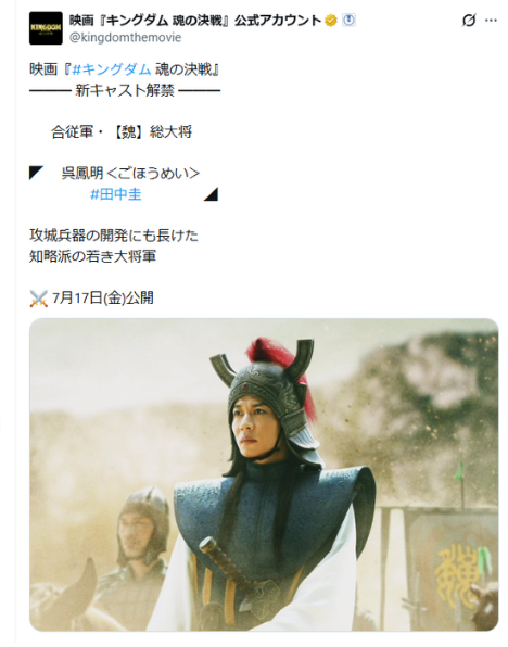 人気漫画の映画化で、この夏配信のキングダム魂の決戦に出演が発表されました。