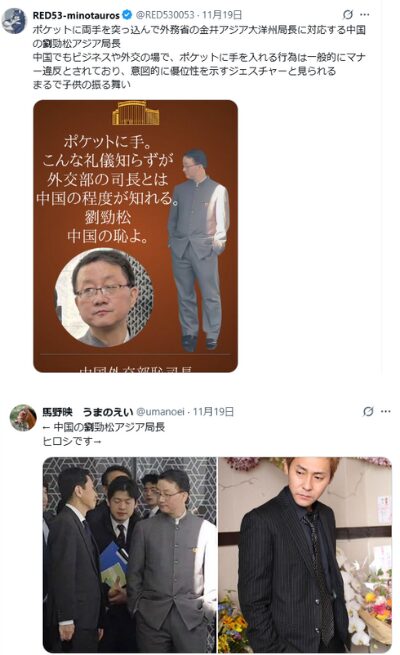 この大喜利はさらに中国外務省の劉勁松アジア局長のポケットに手を入れたマナーのない外交態度にも容赦なく、新たに笑いに変えた投稿が出る始末。