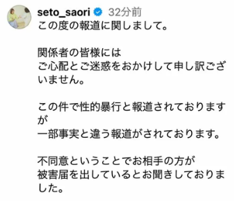 妻の瀬戸サオリが、相手に好意が見られて同意があったととれる内容のコメントをSNSで発表した。